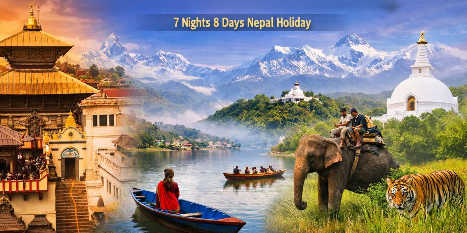 Discover the natural beauty, wildlife adventure, and spiritual heritage of Nepal with this 7 Nights 8 Days Kathmandu Pokhara Chitwan Tour Package. This journey covers the cultural capital Kathmandu, the Himalayan scenic city Pokhara, and the wildlife paradise Chitwan National Park.