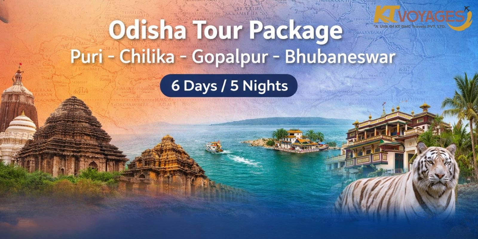 Experience the spiritual essence, coastal beauty, and cultural richness of Odisha with this expertly curated 6-day Odisha tour package by KT Voyages. From the divine darshan at Jagannath Temple Puri to the architectural wonder of Konark Sun Temple, serene waters of Chilika Lake, and peaceful beaches of Gopalpur, this journey offers a perfect blend of spirituality, heritage, and relaxation.