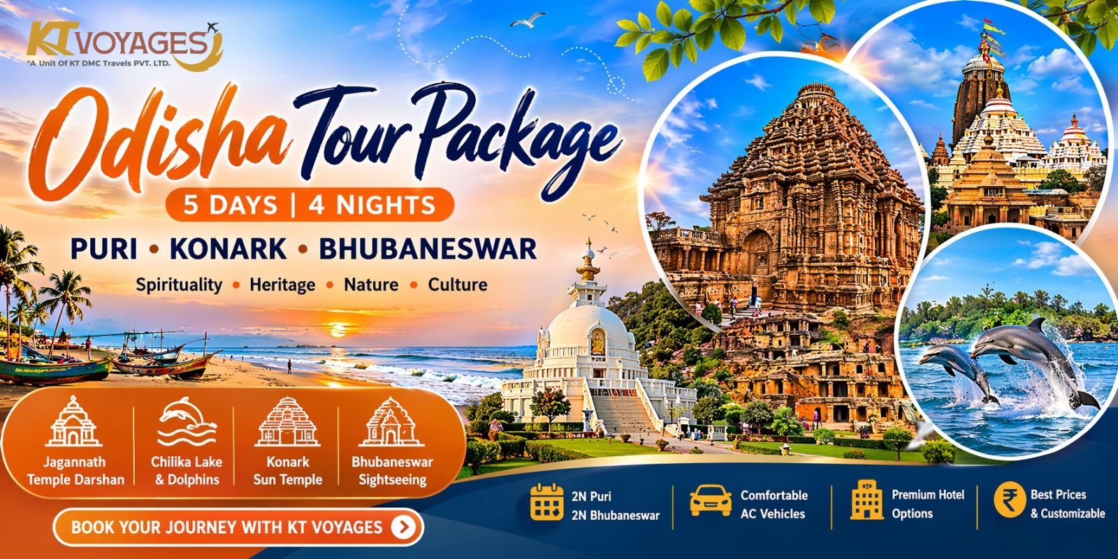 Experience the divine charm of Odisha with KT Voyages. This 5-day Odisha tour package covers sacred temples, pristine beaches, Asia’s largest brackish water lake (Chilika), and UNESCO heritage sites like Konark Sun Temple. Perfect for spiritual seekers, nature lovers, and cultural explorers.